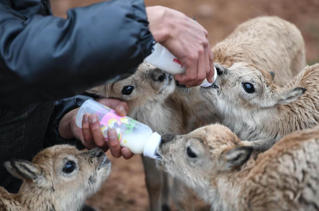 2020年7月7日,三江源國家公園管理局長江源園區(qū)可可西里管理處卓乃湖保護(hù)站的工作人員才文多杰在給藏羚羊幼仔喂奶。新華社記者薛玉斌 攝