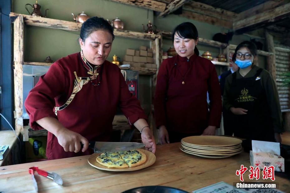 村民在為游客準備“藏式披薩”。王磊 攝