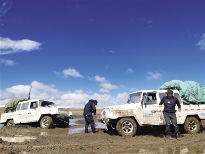 可可西里保護(hù)區(qū)工作人員在巡山途中。右三為布周??煽晌骼锕芾硖幑﹫D