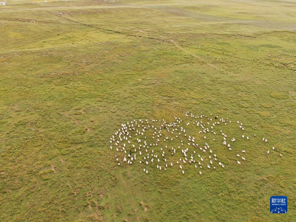 9月15日,一群羊在青海湖岸邊的牧場(chǎng)上覓食(無(wú)人機(jī)照片)。新華社記者 張龍 攝
