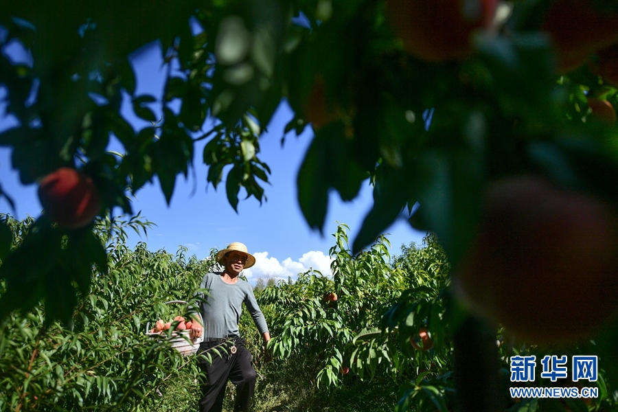 朱聯(lián)產(chǎn)在果園內(nèi)采摘桃子。新華網(wǎng) 潘彬彬 攝