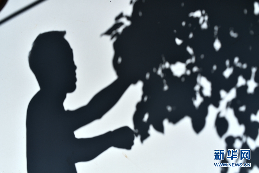 游客在楊林春的農(nóng)家院里采摘水果時映在墻上的影子。新華網(wǎng) 潘彬彬 攝
