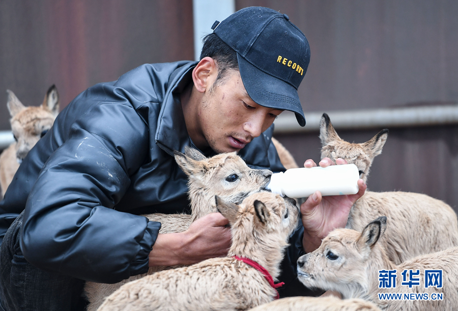 可可西里國家級(jí)自然保護(hù)區(qū)卓乃湖保護(hù)站的工作人員才文多杰在給藏羚羊幼仔喂奶(2020年7月7日攝)。新華社記者 薛玉斌 攝