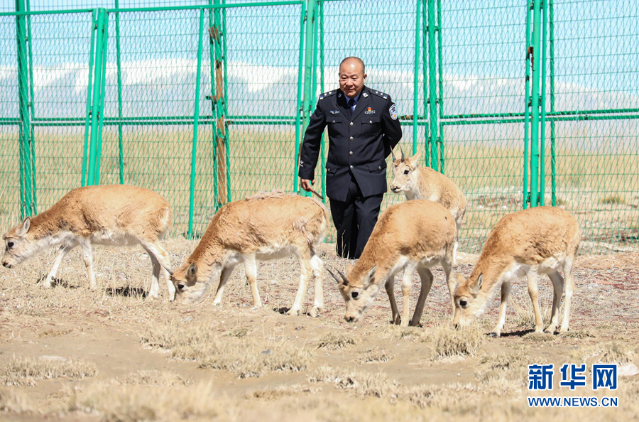 在可可西里國家級(jí)自然保護(hù)區(qū)索南達(dá)杰保護(hù)站,站長趙新錄與藏羚羊在一起(9月28日攝)。新華社記者 李占軼 攝
