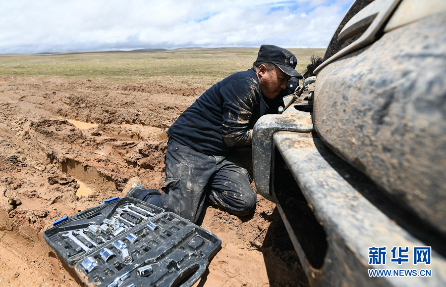 可可西里國家級(jí)自然保護(hù)區(qū)卓乃湖保護(hù)站站長秋培扎西在可可西里地區(qū)修理車輛(2020年7月6日攝)。新華社記者 薛玉斌 攝