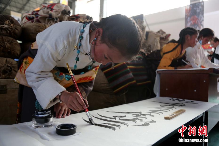 圖為小學(xué)生書寫藏文書法。張?zhí)砀?攝