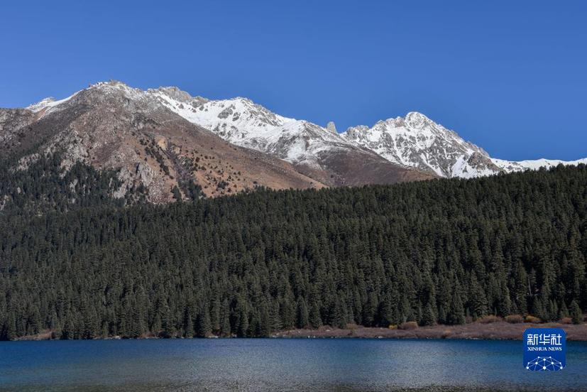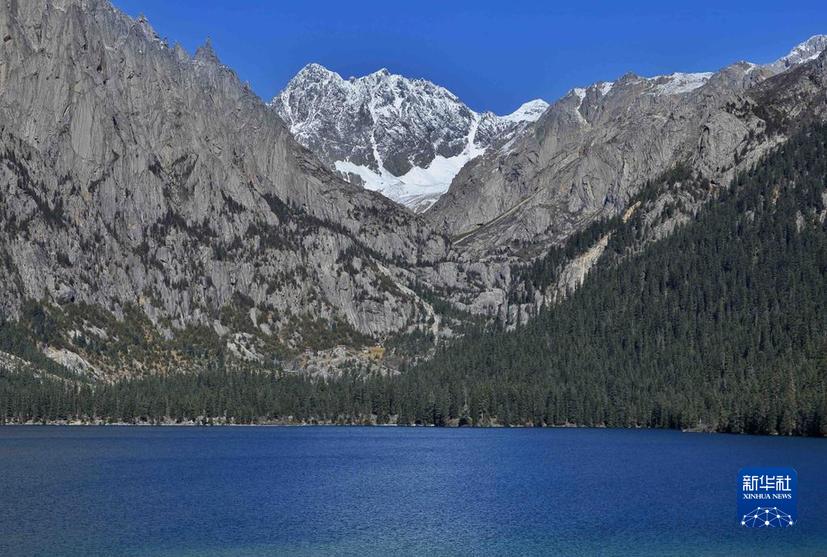 這是10月24日在措普溝景區(qū)內(nèi)拍攝的扎金甲博神山和措普湖。新華社記者 劉坤 攝