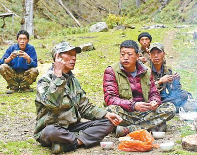 鐘泰(左三)和護林員們在野外巡護間隙用餐。于鳳琴 攝(人民視覺)