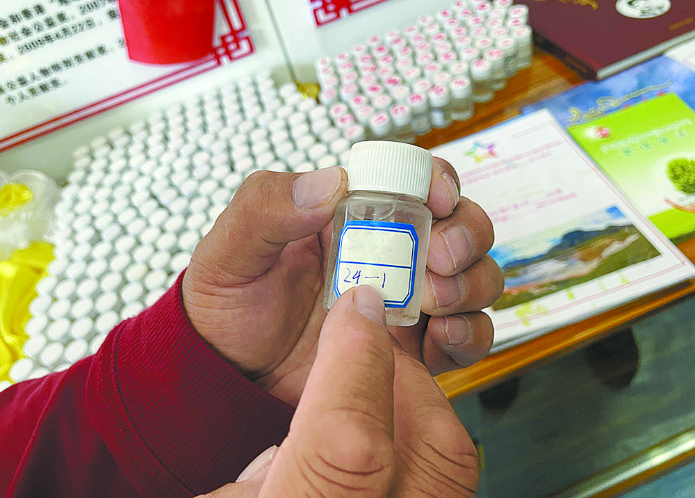 巴洪加羅展示監(jiān)測水源時所取的水樣。李慶玲 攝
