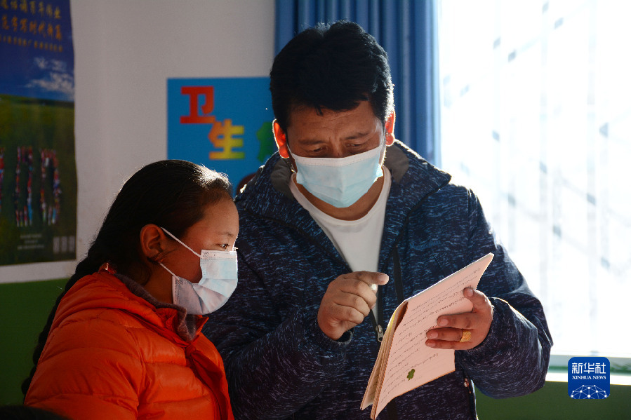 在青海省果洛藏族自治州瑪多縣地震災(zāi)后過渡安置一校區(qū)五年級(jí)二班,教師者才(右)在課堂上為學(xué)生輔導(dǎo)作業(yè)(12月18日攝)。