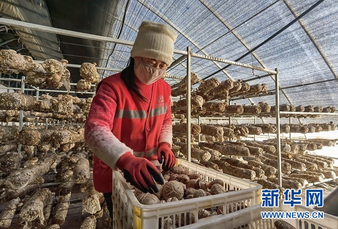 陳璠萍正在香菇種植大棚里整理采摘好的香菇。新華社記者 王銘禹 攝