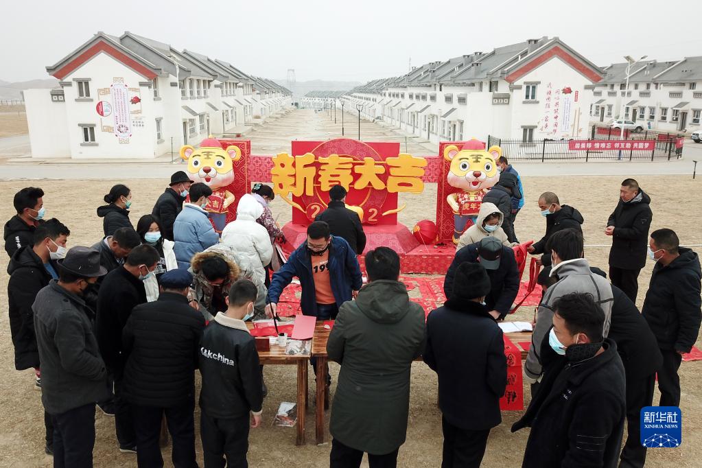 1月25日,在蘭州新區(qū)舟曲避險搬遷安置點,舟曲地質(zhì)災害避險搬遷第一臨時黨支部組織書法家給搬遷群眾送春聯(lián)(無人機照片)。新華社記者 范培珅 攝