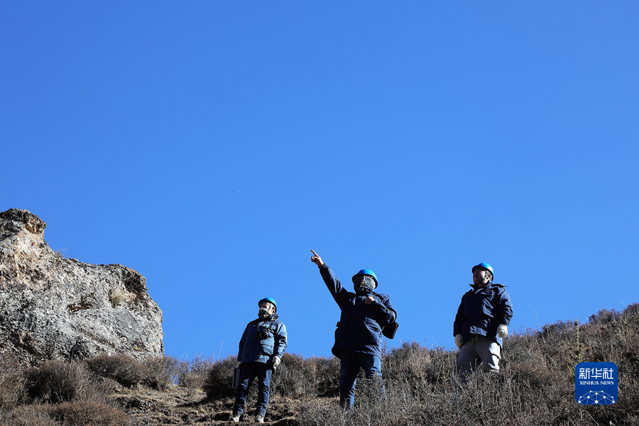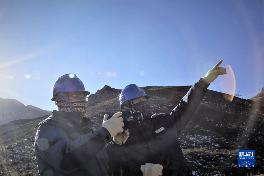 1月19日,國家電網(wǎng)青海省電力公司檢修公司輸電檢修中心專業(yè)班組成員在巡線途中查看線路運行情況。新華社記者 趙玉和 攝