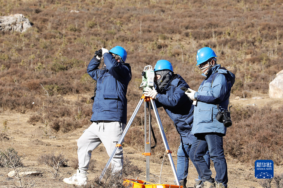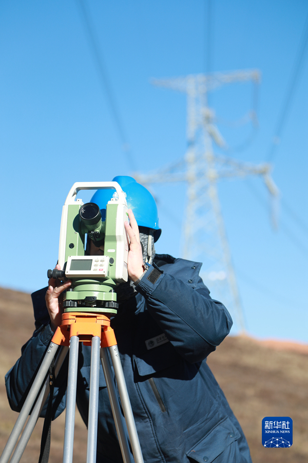 1月19日,國家電網(wǎng)青海省電力公司檢修公司輸電檢修中心專業(yè)班組成員使用經(jīng)緯儀進行線路測量工作。新華社記者 趙玉和 攝
