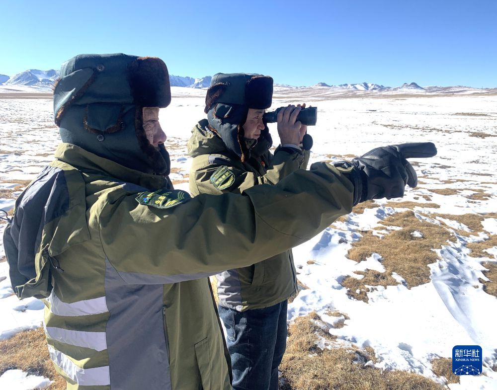 2021年12月3日,祁連山國(guó)家公園沙龍灘管護(hù)站站長(zhǎng)祁進(jìn)賢(右)在用望遠(yuǎn)鏡觀測(cè)。新華社 李琳海 攝