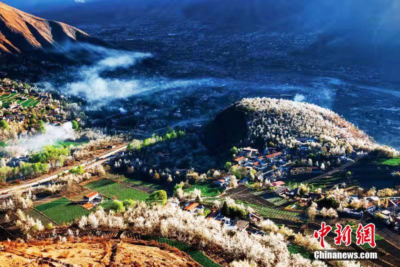 近日,四川省阿壩州金川縣萬畝梨花綻放,滿山遍野,雪白的梨花,隨風(fēng)飄絮,藍天白云,花海飄香,令人陶醉,吸引眾多游客前來游覽、拍照。[詳細] -