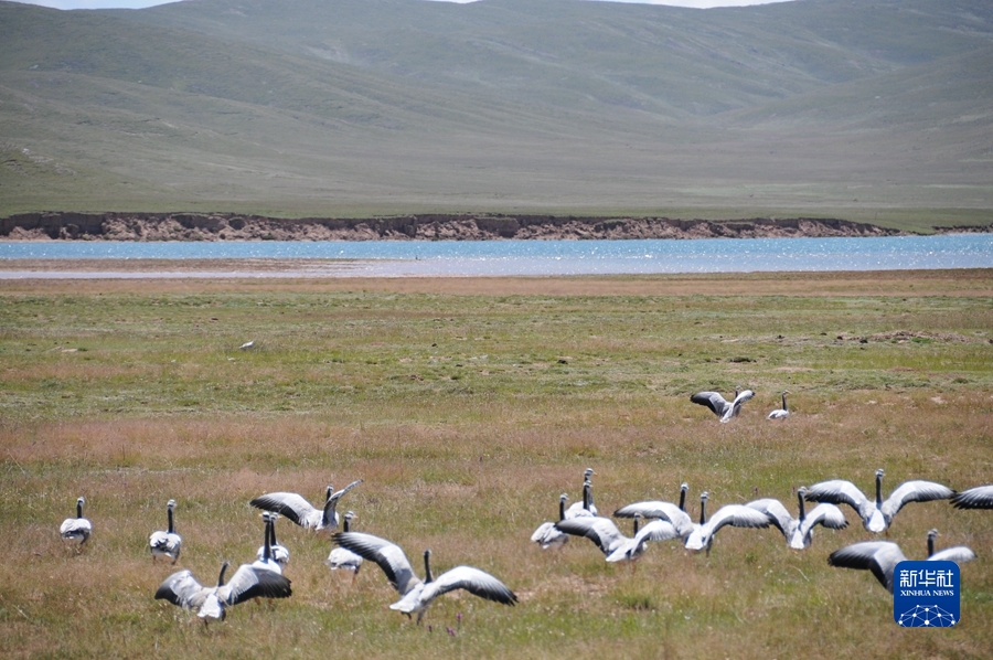 2020年8月19日,在三江源國(guó)家公園黃河源園區(qū)內(nèi),一群斑頭雁在黃河邊草地上翩然起飛。新華社記者 呂雪莉 攝