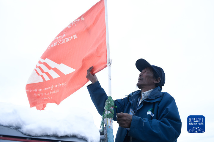 2021年10月20日,在青海省果洛藏族自治州瑪多縣扎陵湖鄉(xiāng)勒那村,三江源國(guó)家公園黃河源園區(qū)生態(tài)管護(hù)員安才在整理管護(hù)隊(duì)旗幟。新華社記者 張龍 攝