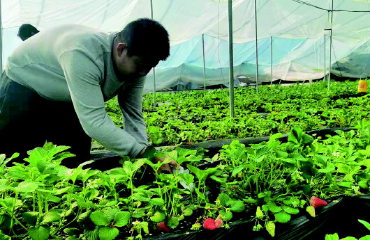 走進(jìn)種植園,一派熱火朝天的工作景象。種植員疏花疏果,設(shè)施工人爬上塑料薄膜大棚進(jìn)行日常監(jiān)測(cè)維修……所有工作都在有條不紊地進(jìn)行,為優(yōu)質(zhì)草莓生長(zhǎng)提供保障。