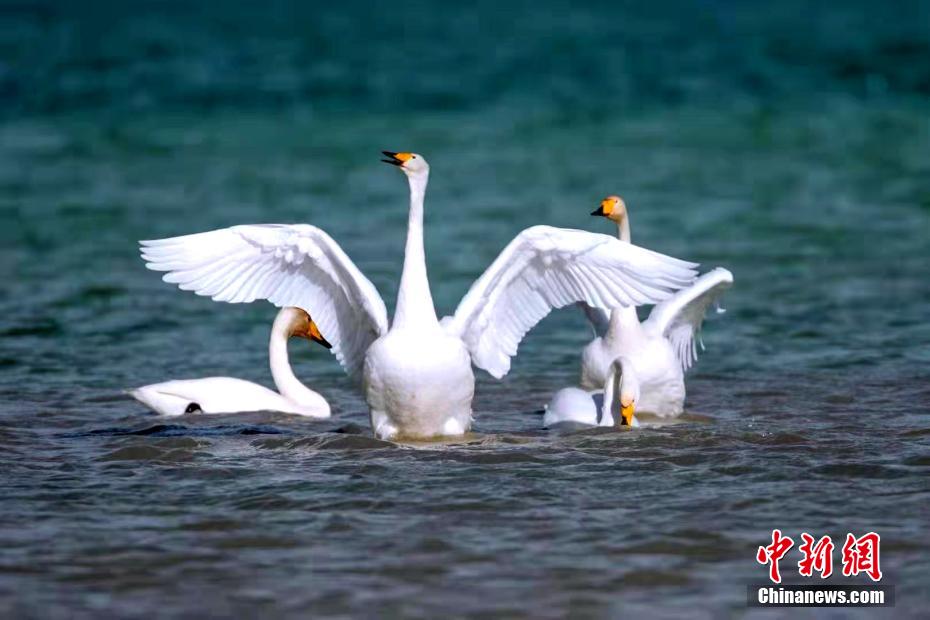 圖為天鵝群在湖中起舞。 戴永峰 攝