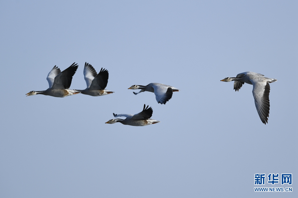 斑頭雁在青海湖上空飛過。新華網(wǎng) 潘彬彬 攝