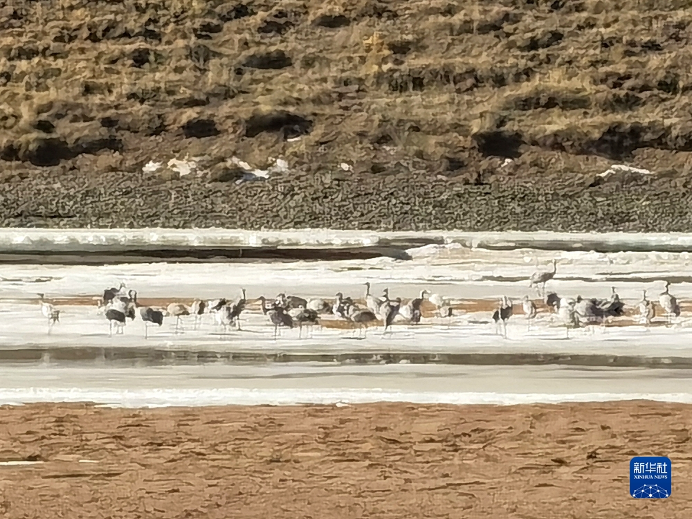 3月13日,在位于瑪多縣境內(nèi)的三江源國家公園黃河源園區(qū),記者拍攝到的一群蓑羽鶴在黃河干流河道間棲息覓食。新華社記者 呂雪莉 攝