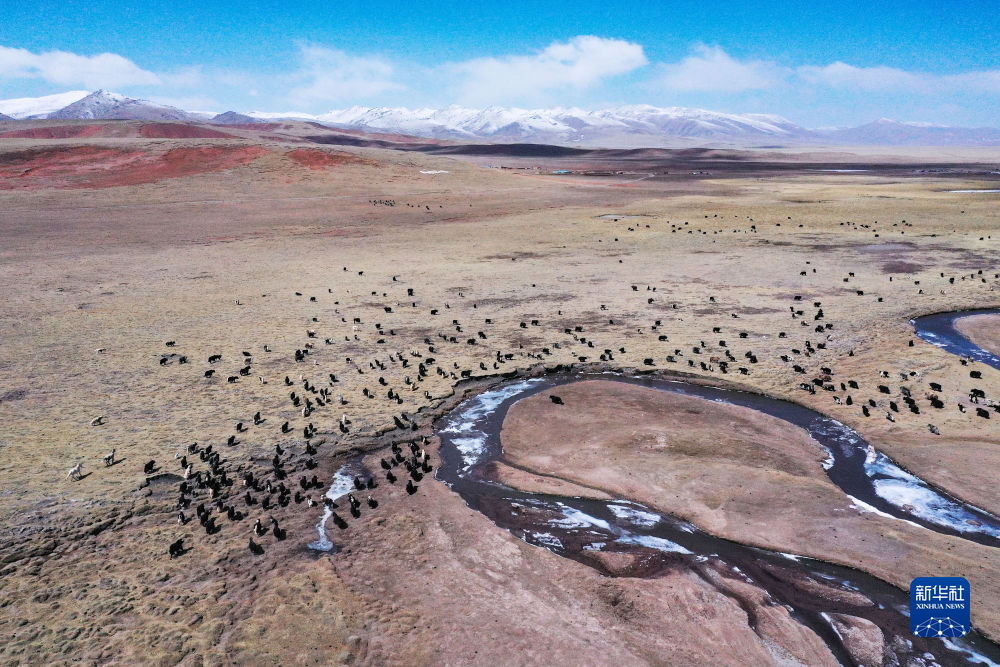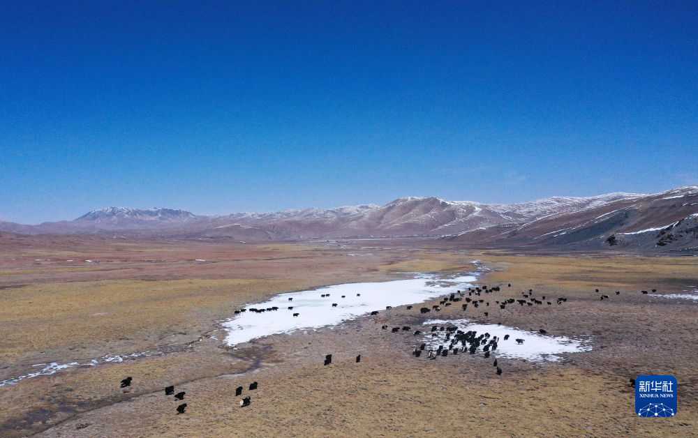 4月19日,在青海省玉樹藏族自治州曲麻萊縣,牦牛在草原上覓食(無人機照片)。新華社記者 張龍 攝