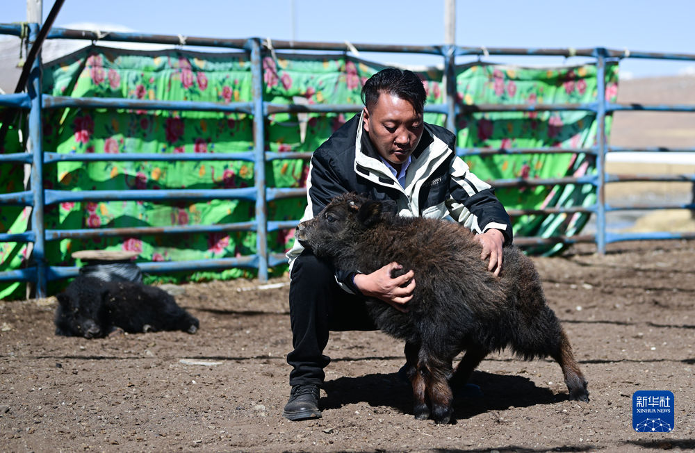 4月20日,在青海省玉樹藏族自治州曲麻萊縣,牧民在查看牛犢生長情況。新華社記者 張龍 攝