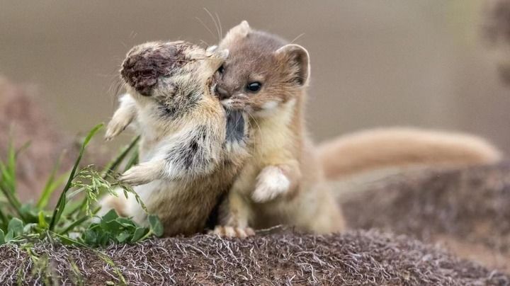 2021年7月22日在祁連山國家公園青海片區(qū)拍攝的一只香鼬(右)叼著一只捕獲的鼠兔。鮑永清 攝 新華社發(fā)