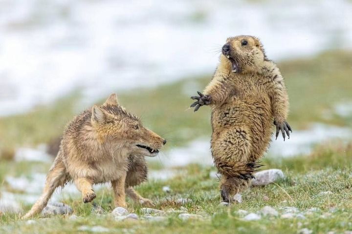 這是2018年6月7日鮑永清在祁連山國家公園青海片區(qū)拍攝的作品《生死對決》(左為藏狐,右為旱獺)。鮑永清 攝 新華社發(fā)