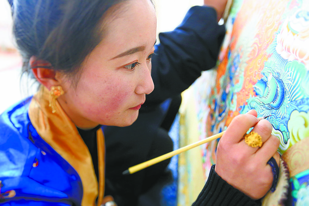 精心謀篇布局,同仁市將唐卡、堆繡、泥塑、刺繡等熱貢藝術(shù)特色產(chǎn)業(yè)作為第三產(chǎn)業(yè)的“龍頭”,優(yōu)化文化產(chǎn)業(yè)架構(gòu),培育文化產(chǎn)業(yè)經(jīng)營(yíng)主體,推動(dòng)其與多業(yè)態(tài)融合,使熱貢藝術(shù)特色產(chǎn)業(yè)呈現(xiàn)出全新的姿態(tài)。