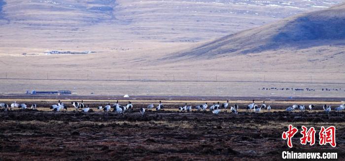 圖為黑頸鶴在嘉塘草原漫步。稱多縣委宣傳部供圖