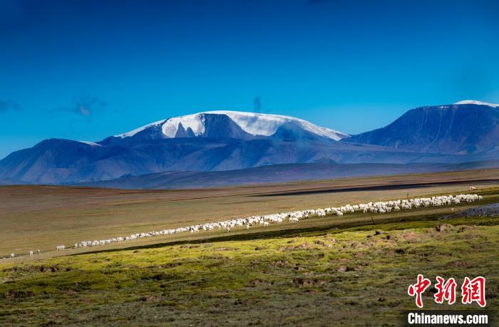 圖為天峻縣境內(nèi)的草原和藍天、雪山相照映。天峻縣委宣傳部 供圖