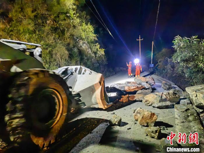 前往震中道路有落石。四川森林消防供圖