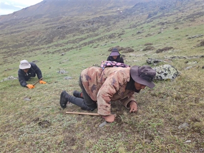 貢呷洛珠穿著棉襖,腿上綁著橡膠護(hù)膝,雙膝跪在草地上,俯身搜尋。與他結(jié)伴的是村里的恩珠夫妻倆,他們也趴著身子,不放過(guò)眼前的每一寸草地。