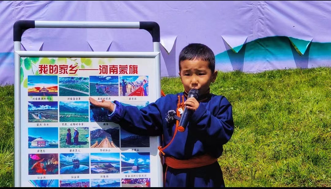 “我的家鄉(xiāng)在中國(guó)西部,這里有一片非常美麗的大草原,大家都喜歡叫她‘河南蒙旗’,這里有藍(lán)天、白云、草原、牛羊、湖泊、河流……”來(lái)自青海省黃南藏族自治州河南蒙古族自治縣中心幼兒園五歲半的觀卻東珠作為“講解員”,正聲情并茂的向老師、同學(xué)以及家長(zhǎng)介紹自己的家鄉(xiāng)。