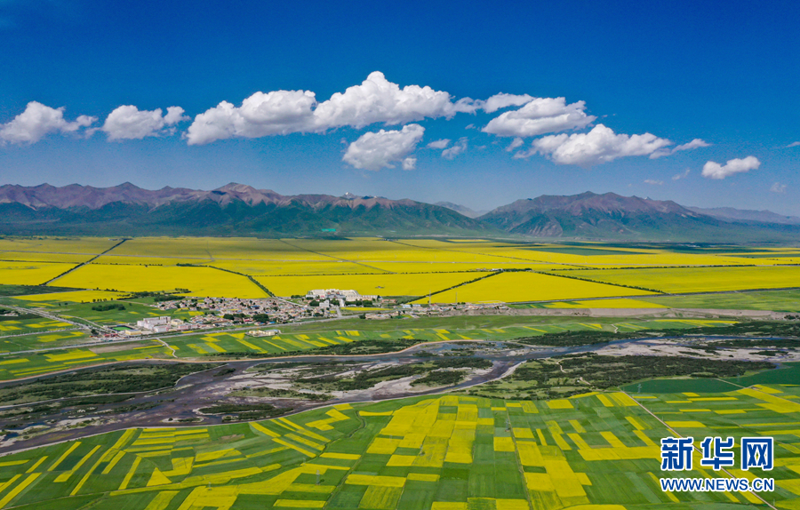 金黃色的油菜花在藍天白云映襯下,形成了一幅壯麗畫卷。新華網(wǎng) 宋忠勇 攝