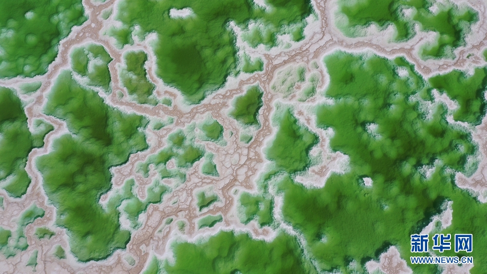 8月15日,航拍地處青海省海西州茫崖市的翡翠湖。翡翠湖是一個(gè)人工鹽湖,田字狀的湖水呈現(xiàn)出青翠的色彩。[詳細(xì)] -