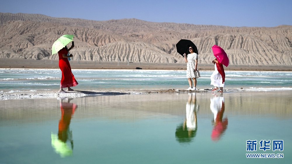 7月22日,游客在海西州茫崖市境內(nèi)的翡翠湖游玩。
