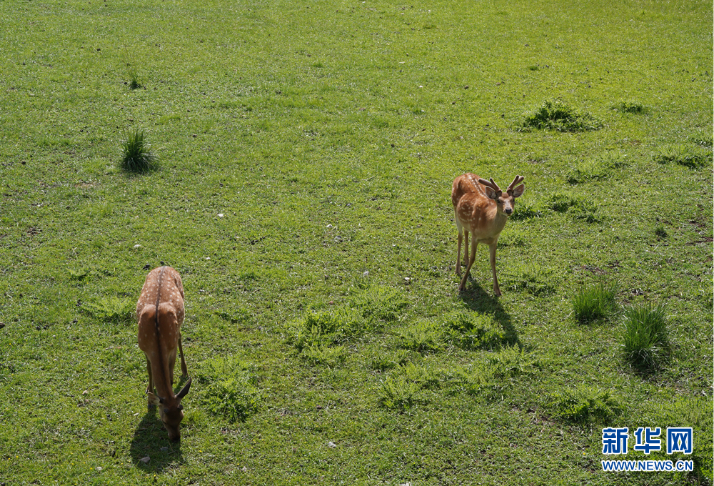 祁連鹿場(chǎng),兩只梅花鹿正在愜意地吃草。新華網(wǎng) 卡婭梅朵 攝