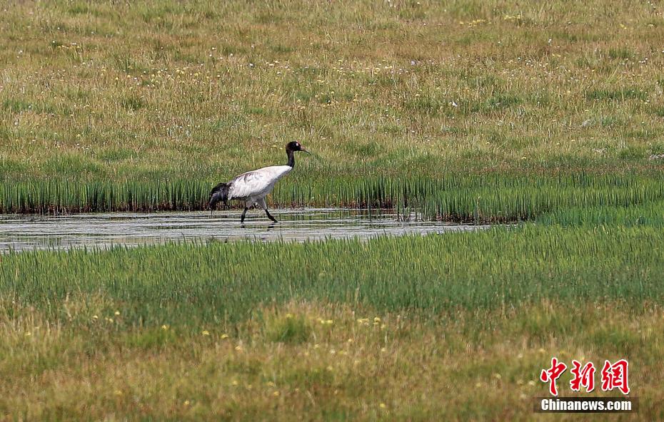 圖為一只悠閑踱步的黑頸鶴。 賈天勇 攝