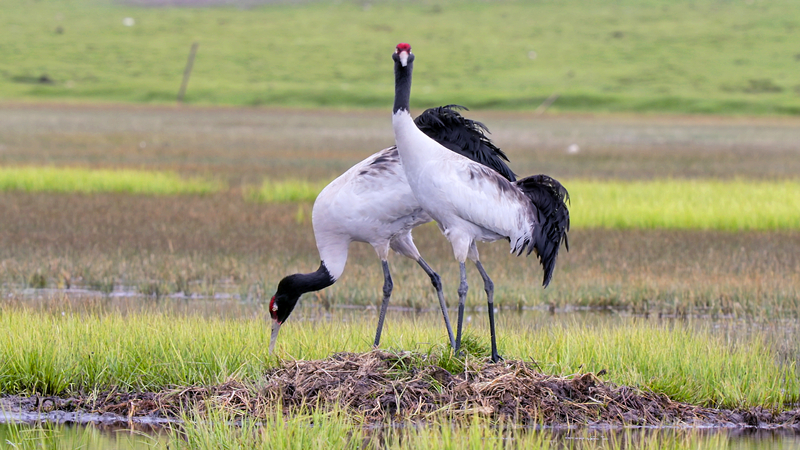 通常每年3月底至4月初,黑頸鶴都會(huì)飛到繁殖地?fù)衽冀慌?,然后在高原濕地、那灘、四面環(huán)水的草墩、蘆葦叢或地面營(yíng)巢。5月至7月是黑頸鶴繁殖的時(shí)間,黑頸鶴通常每窩會(huì)產(chǎn)2枚卵,第1枚卵產(chǎn)下后就開(kāi)始孵化。孵化由夫婦共同輪流承擔(dān),一只孵卵,另外一只就會(huì)在巢穴附近“巡邏”,以保證黑頸鶴寶寶的安全“出生”。鶴卵孵化出幼鶴,大約需要一個(gè)月的時(shí)間。