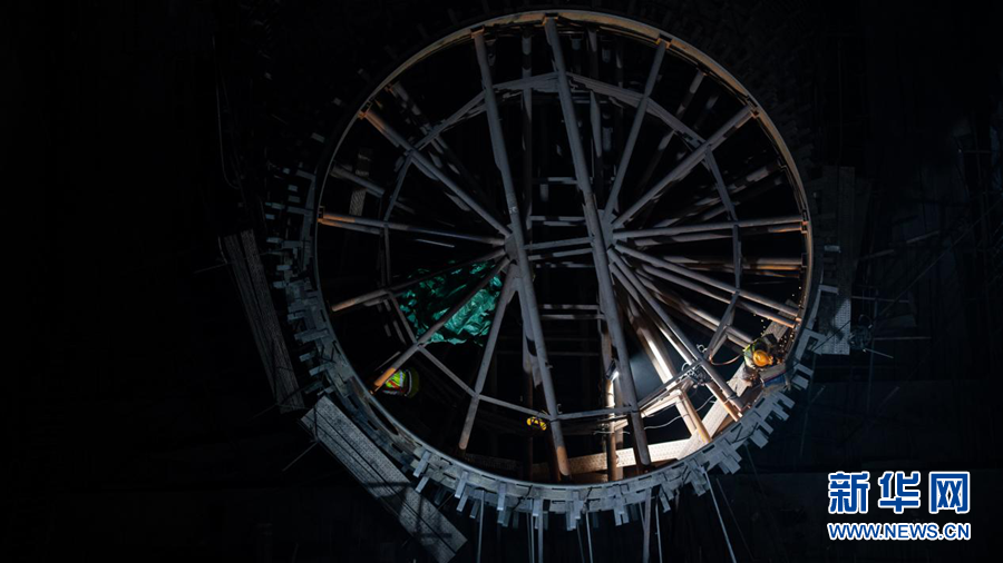 瑪爾擋公司工作人員在水電站地下廠房建設(shè)現(xiàn)場(chǎng)查看工程進(jìn)度。新華網(wǎng) 潘彬彬 攝