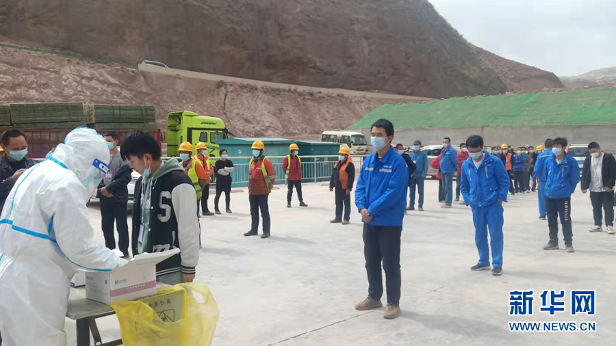瑪爾擋水電站建設(shè)現(xiàn)場(chǎng),施工人員排隊(duì)進(jìn)行核酸檢測(cè)。新華網(wǎng) 劉小芳 攝