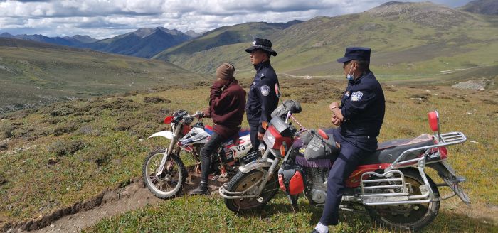 禾尼鄉(xiāng)派出所接到求助后,立即安排在附近開展工作的草原騎警隊(duì)警力寧紅玉、澤仁公布、格絨降措帶領(lǐng)熟悉附近地形的派出所群防群治義警隊(duì)員丁真稱乃,騎摩托車趕赴現(xiàn)場(chǎng)。期間,草原騎警隊(duì)協(xié)調(diào)附近牧民租借3臺(tái)摩托車前往迷路地方尋找,因迷路地點(diǎn)在海拔4800多米的高山,草原騎警隊(duì)翻山越嶺,經(jīng)過(guò)3個(gè)多小時(shí)的尋找,與迷路人員家屬在一山坳處找到德洛。家屬滿含熱淚的看著草原騎警隊(duì)隊(duì)員說(shuō),“麻煩你們了,謝謝你們了,你們辛苦了。”
