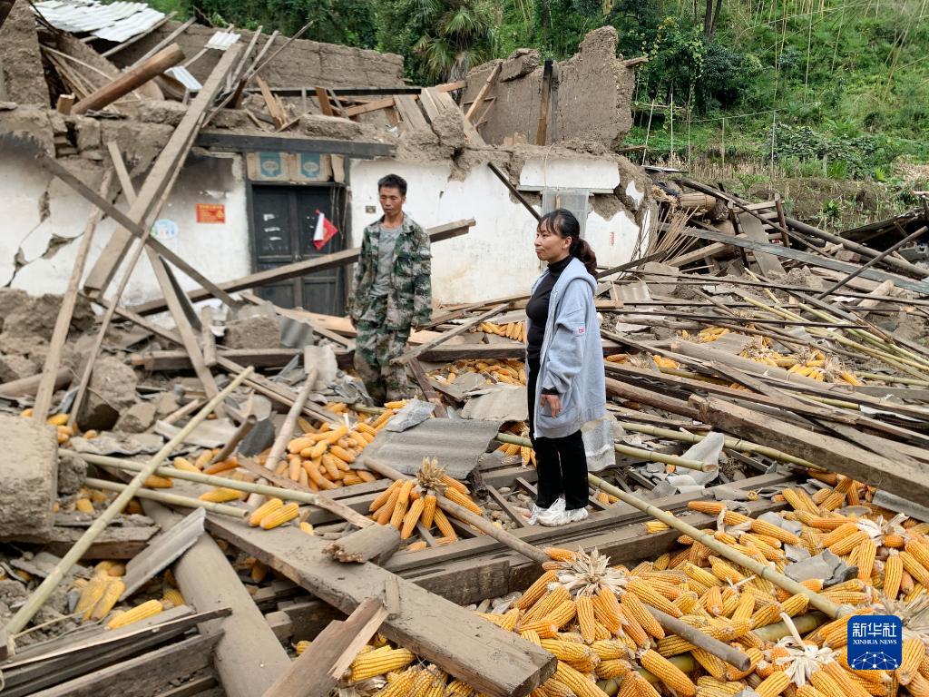9月7日,在雅安市石棉縣王崗坪彝族藏族鄉(xiāng)幸福村二組,養(yǎng)蜜蜂為生的康貝兵(左)、陳云夫婦站在倒塌的房屋中。新華社記者 才揚 攝