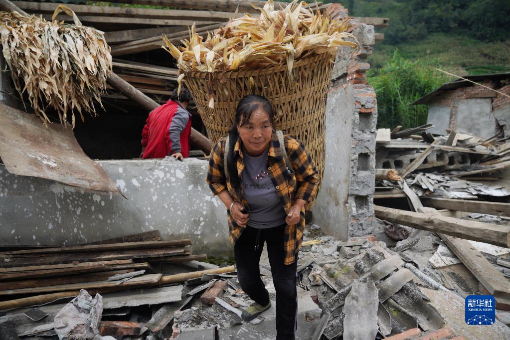 9月7日,在雅安市石棉縣王崗坪彝族藏族鄉(xiāng)幸福村二組,村民在倒塌的豬圈中搬運苞米葉。新華社記者 才揚 攝