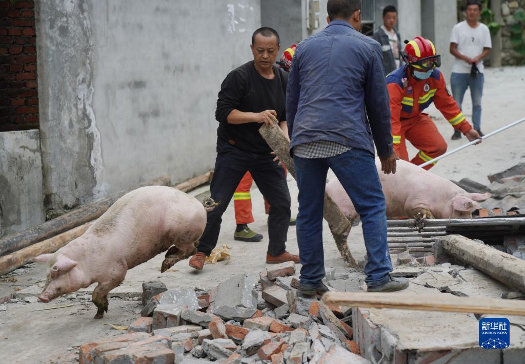9月7日,在雅安市石棉縣王崗坪彝族藏族鄉(xiāng)幸福村二組,消防救援隊員協(xié)助村民從倒塌的豬圈中轉(zhuǎn)移豬。新華社記者 才揚 攝