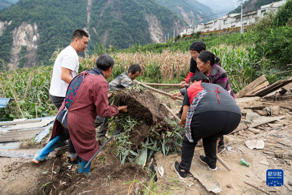9月7日,在雅安市石棉縣王崗坪彝族藏族鄉(xiāng)幸福村二組,村民清理廢墟。新華社記者 才揚 攝