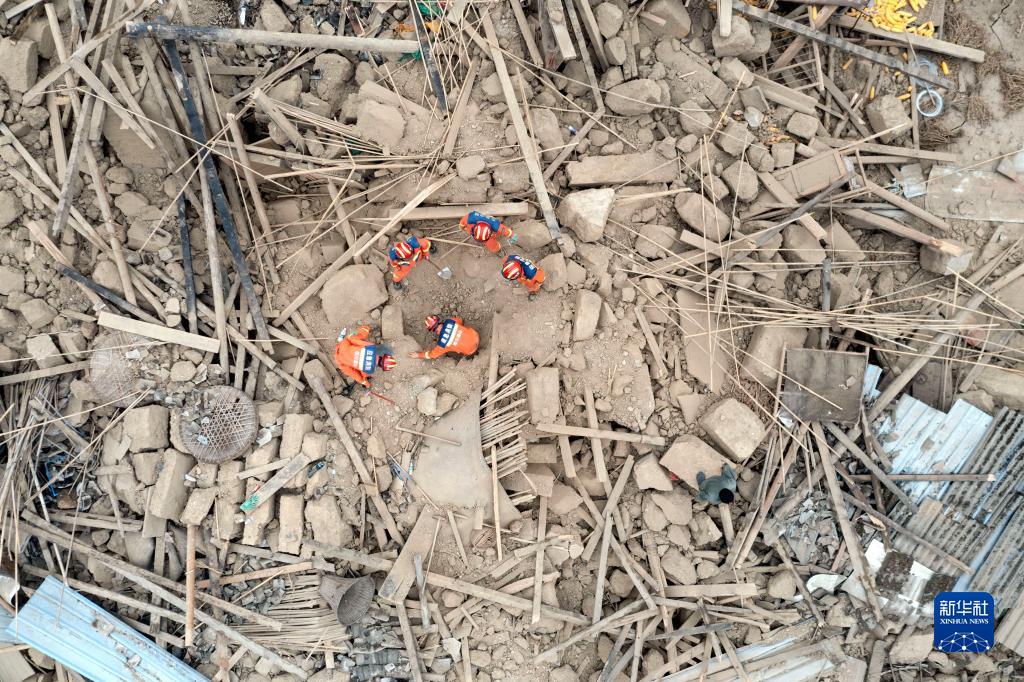 9月7日,在雅安市石棉縣王崗坪彝族藏族鄉(xiāng)幸福村二組,四川眉山消防救援隊隊員幫助村民在倒塌的房屋中找尋物品(無人機照片)。新華社記者 才揚 攝